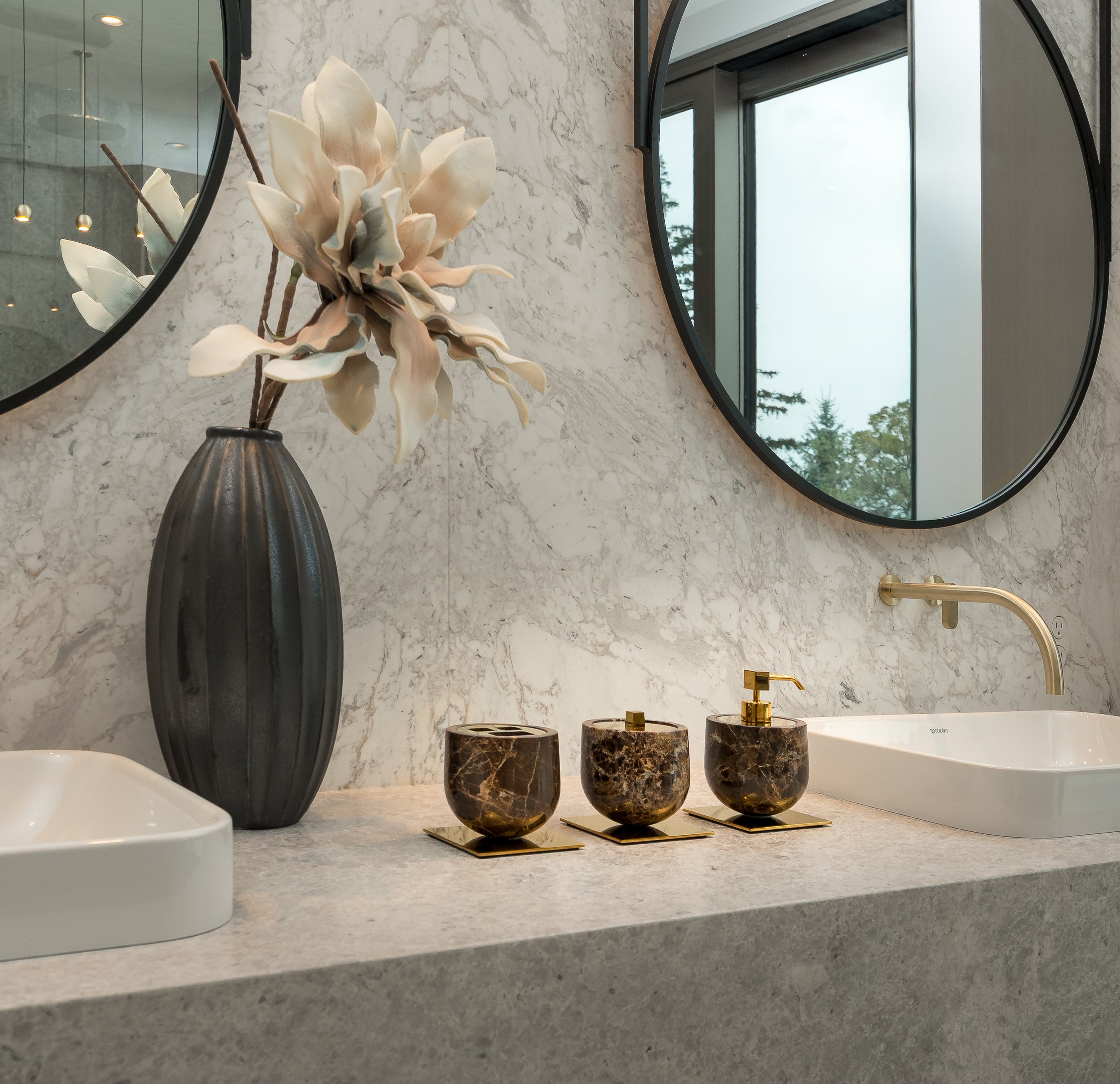 Piani Collection Crafted from natural stones transforms bathroom essentials into sculptural accents.