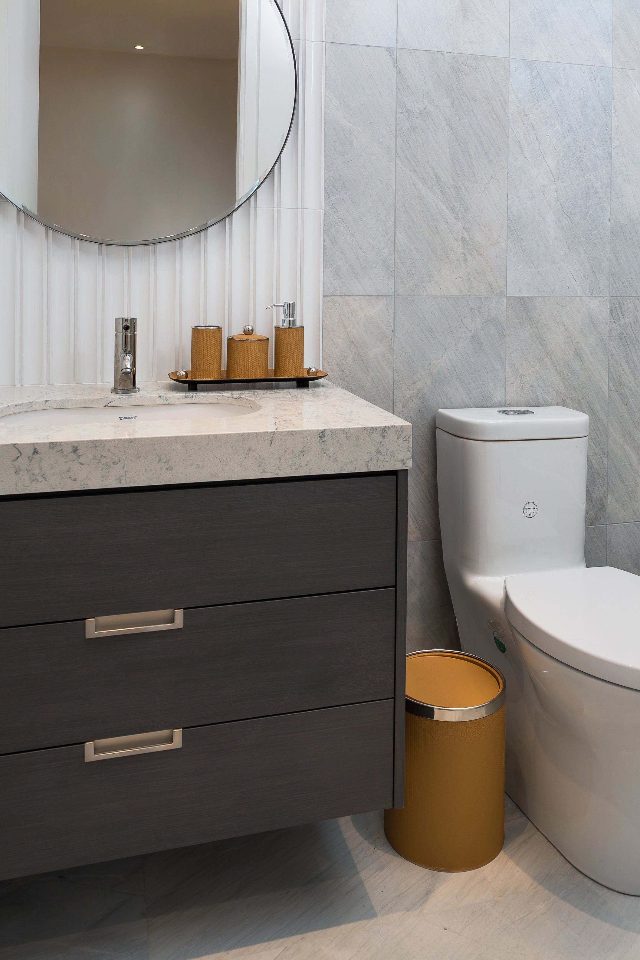 Explore this collectionThe Lamon series pairs textured leather with 304 stainless steel for refined, functional bathroom essentials. From dispenser to tray, trash can to toilet brush, each piece delivers sleek utility with understated elegance.