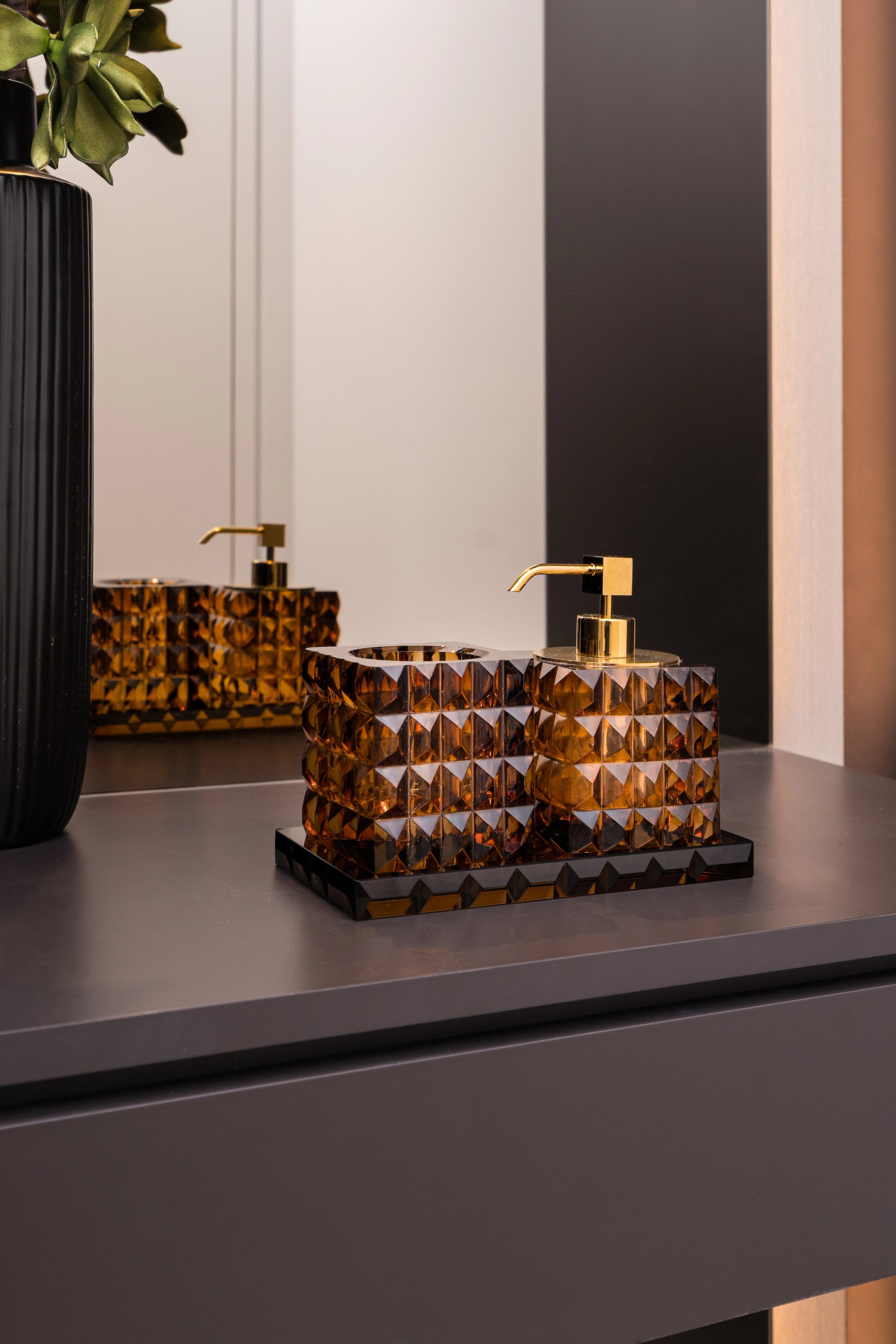 Explore this collectionThe Visona collection by Nootk pairs sculptural crystal design with everyday function. Handcrafted in Canada, the faceted soap dispenser with stainless steel pump and toothbrush holder rest on a coordinating tray. Sleek and luminous, this refined trio adds balance, cohesion, and timeless sophistication to any contemporary vanity or bathroom space.