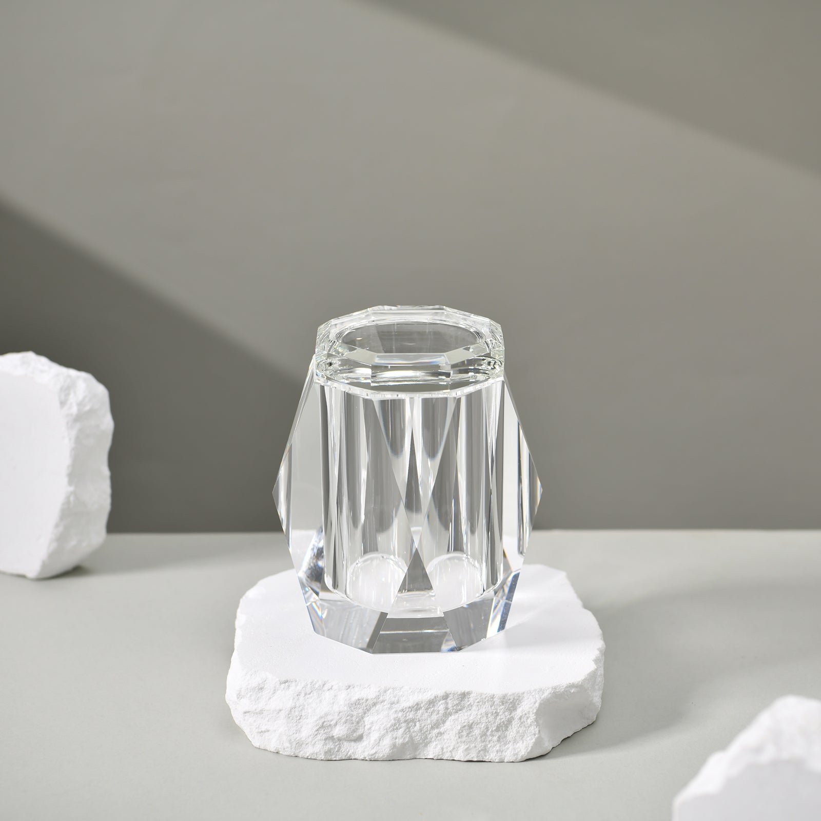 Elevate your bathroom space with the Pianza, an exquisite handcrafted crystal Cotton swab holder from Nootk. Designed in Canada, this piece blends modern geometry with timeless elegance. Its multi-faceted silhouette and jewel-like form transform everyday utility into a luxurious statement.