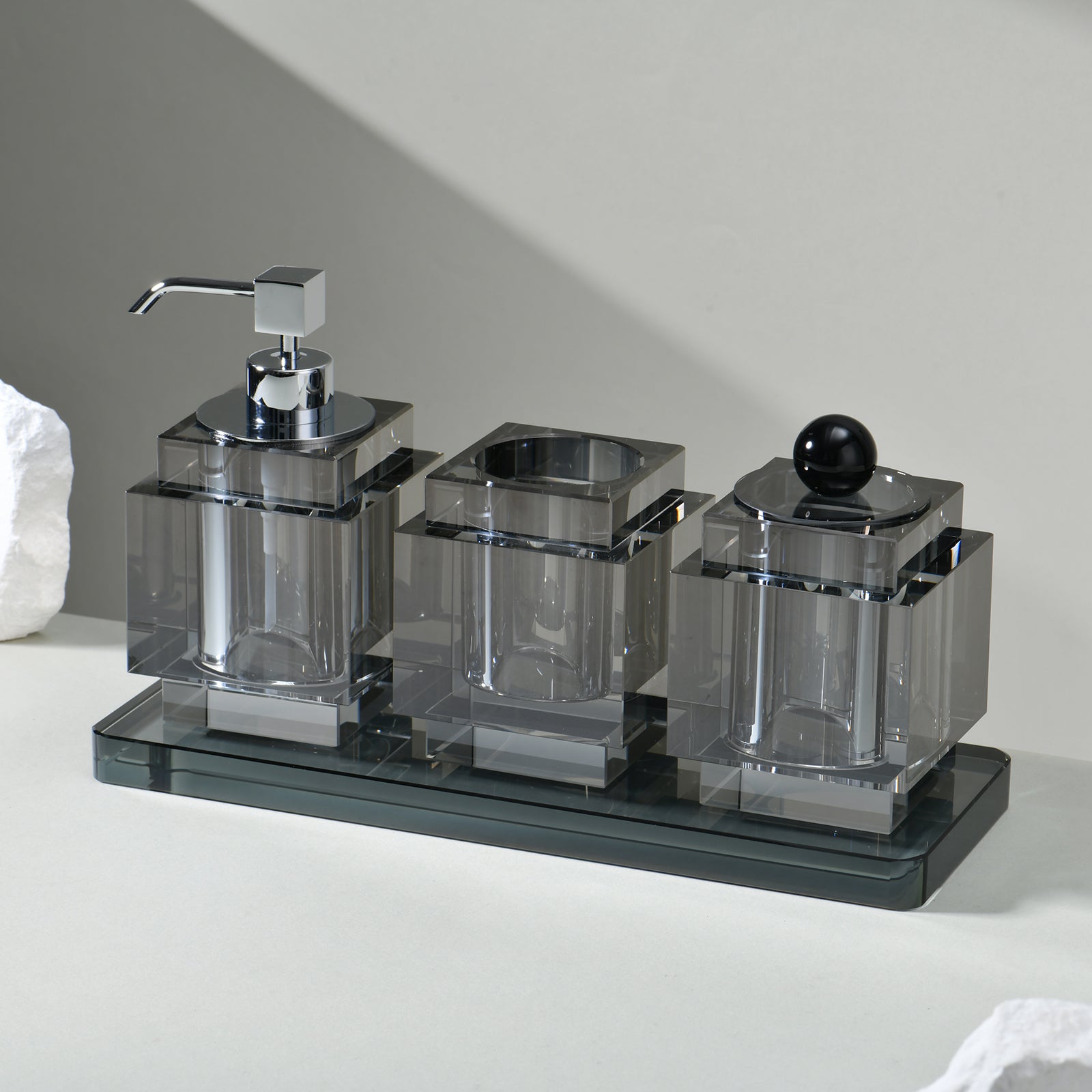 Each piece is cut from high-quality crystal and polished by hand to achieve exceptional brilliance. The soap dispenser is fitted with a brass pump for lasting performance, while the toothbrush holder and canister showcase a faceted silhouette that reflects light from every angle. A matching tray completes the arrangement, offering a grounded, cohesive presentation.