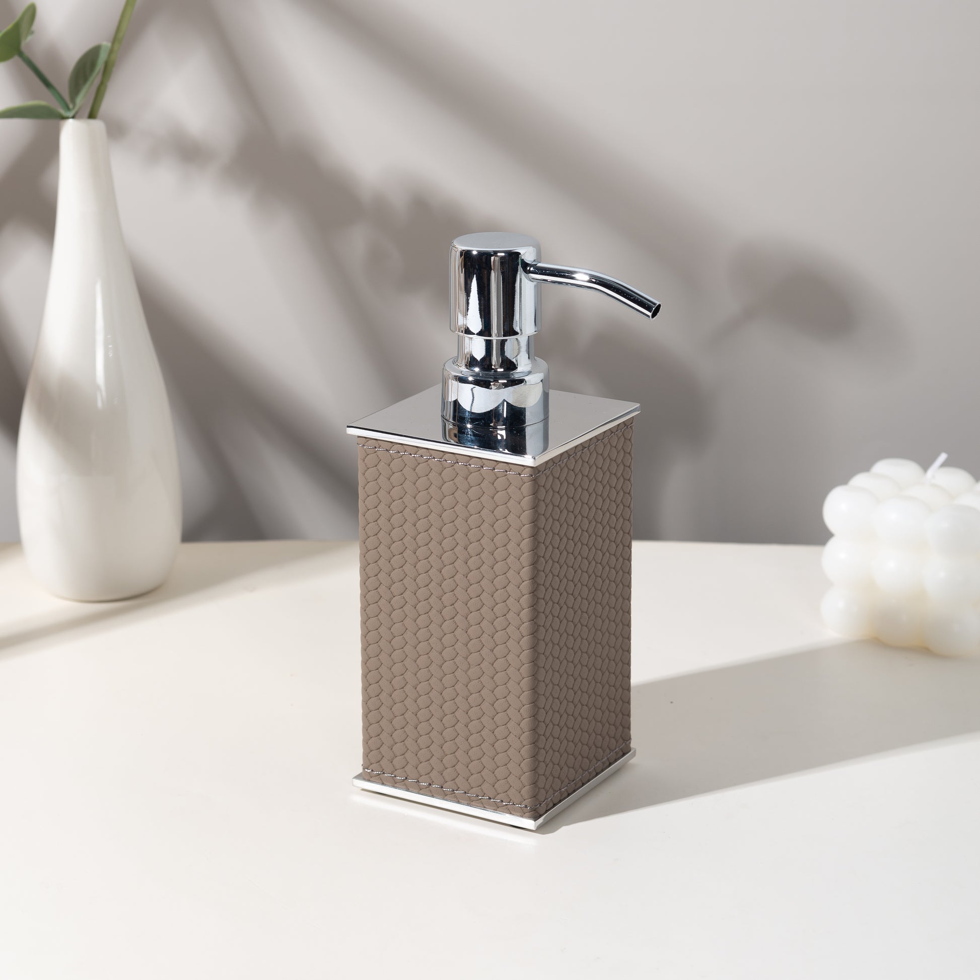 Elevate your daily routine with the Lamon soap dispenser, where form meets function in refined harmony. Built around a durable 304 stainless steel core and wrapped in richly textured leather, this dispenser features a smooth-action stainless steel pump. Its clean lines and tactile finish bring quiet sophistication to any bathroom setting.