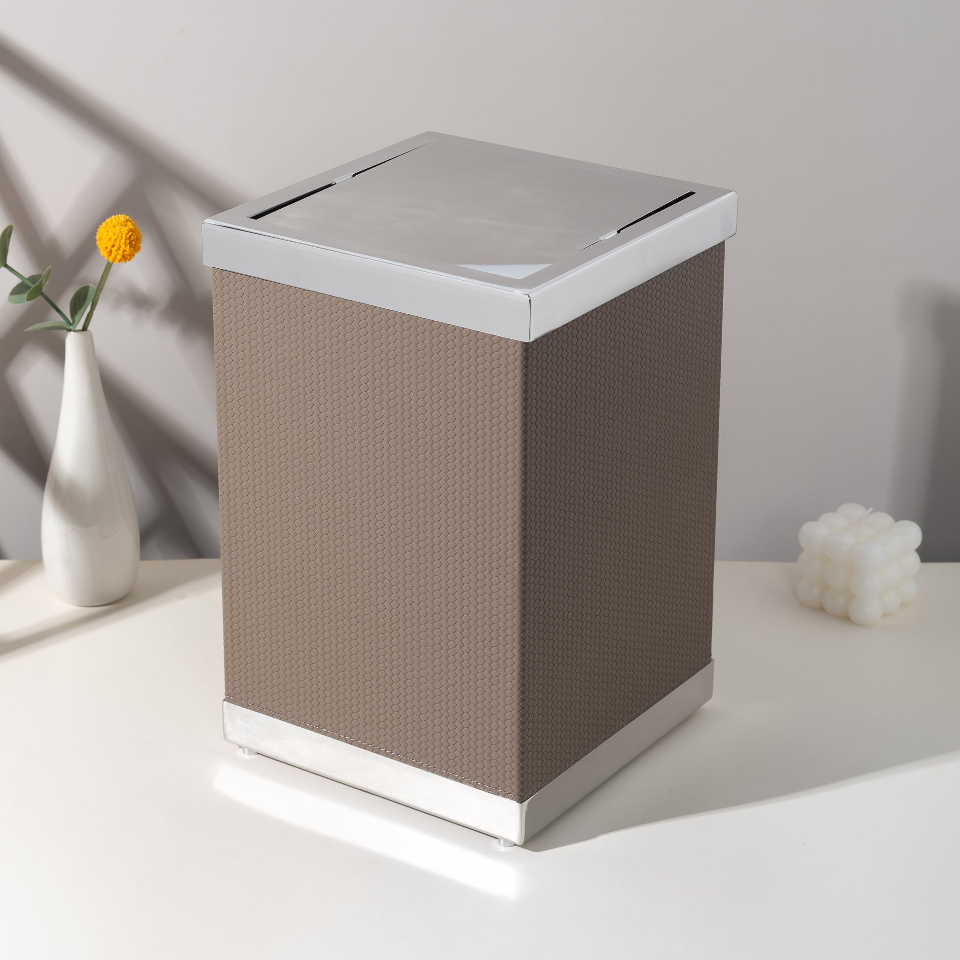 The Lamon trash can blends utility with architectural elegance. Its clean-lined silhouette is constructed from stainless steel and wrapped in textured leather for a modern yet grounded presence. Designed to integrate seamlessly into elevated interiors, it brings discreet function with a sophisticated finish.