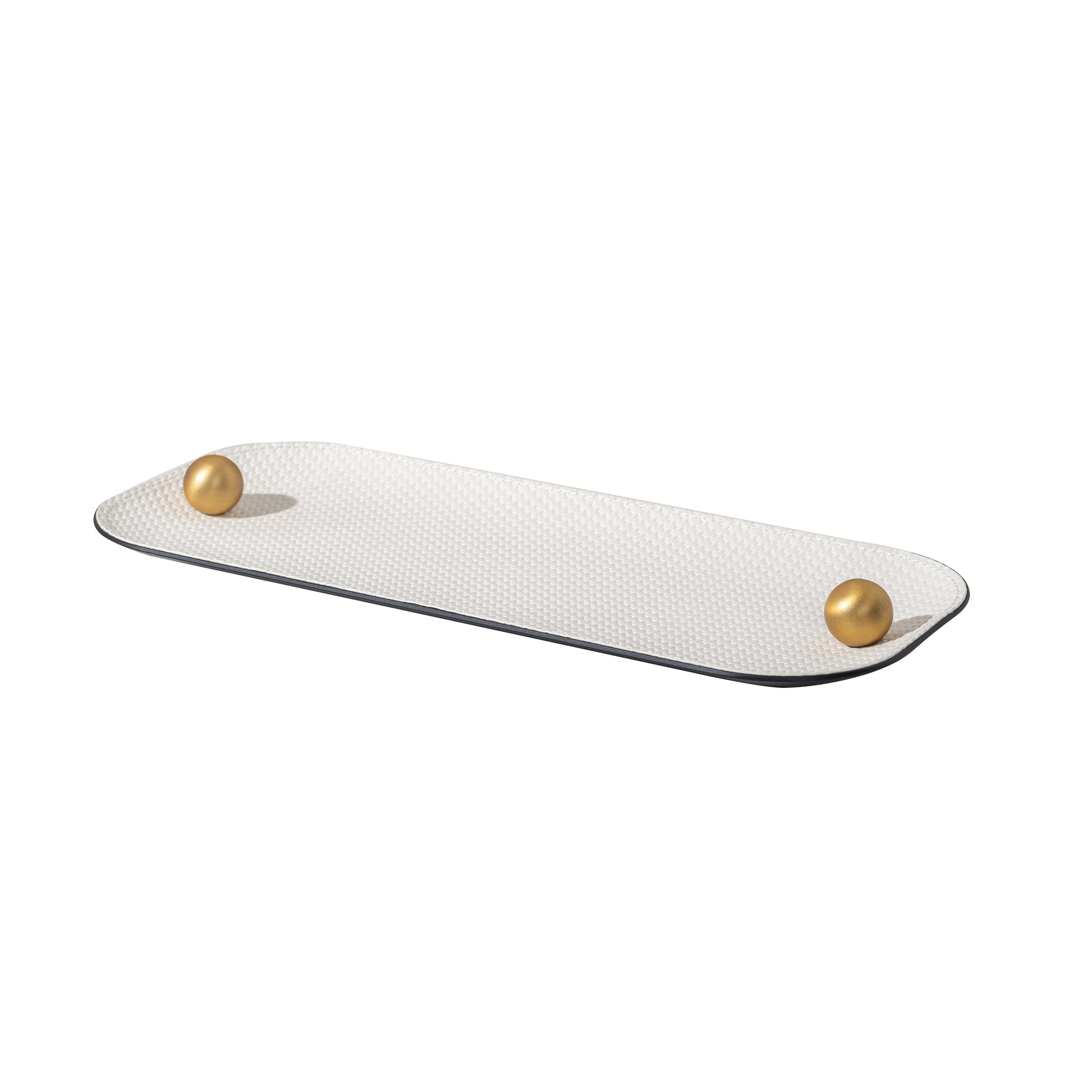 Bringing cohesion and structure to your countertop, the Lamon tray serves as the foundation of the collection. Crafted from stainless steel and finished with coordinating leather accents, it anchors the dispenser, toothbrush holder, and canister in an elegant, unified display.