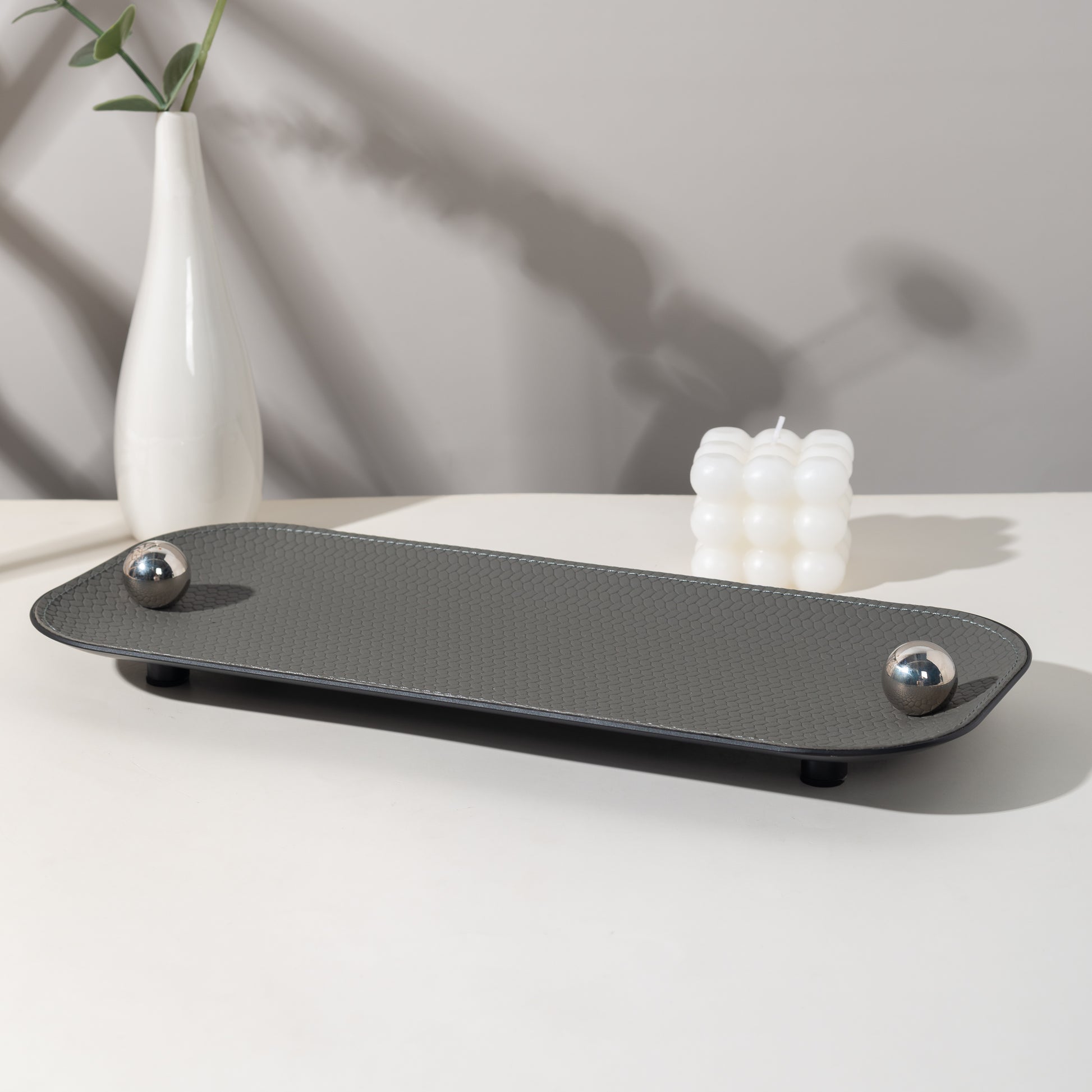 Bringing cohesion and structure to your countertop, the Lamon tray serves as the foundation of the collection. Crafted from stainless steel and finished with coordinating leather accents, it anchors the dispenser, toothbrush holder, and canister in an elegant, unified display.