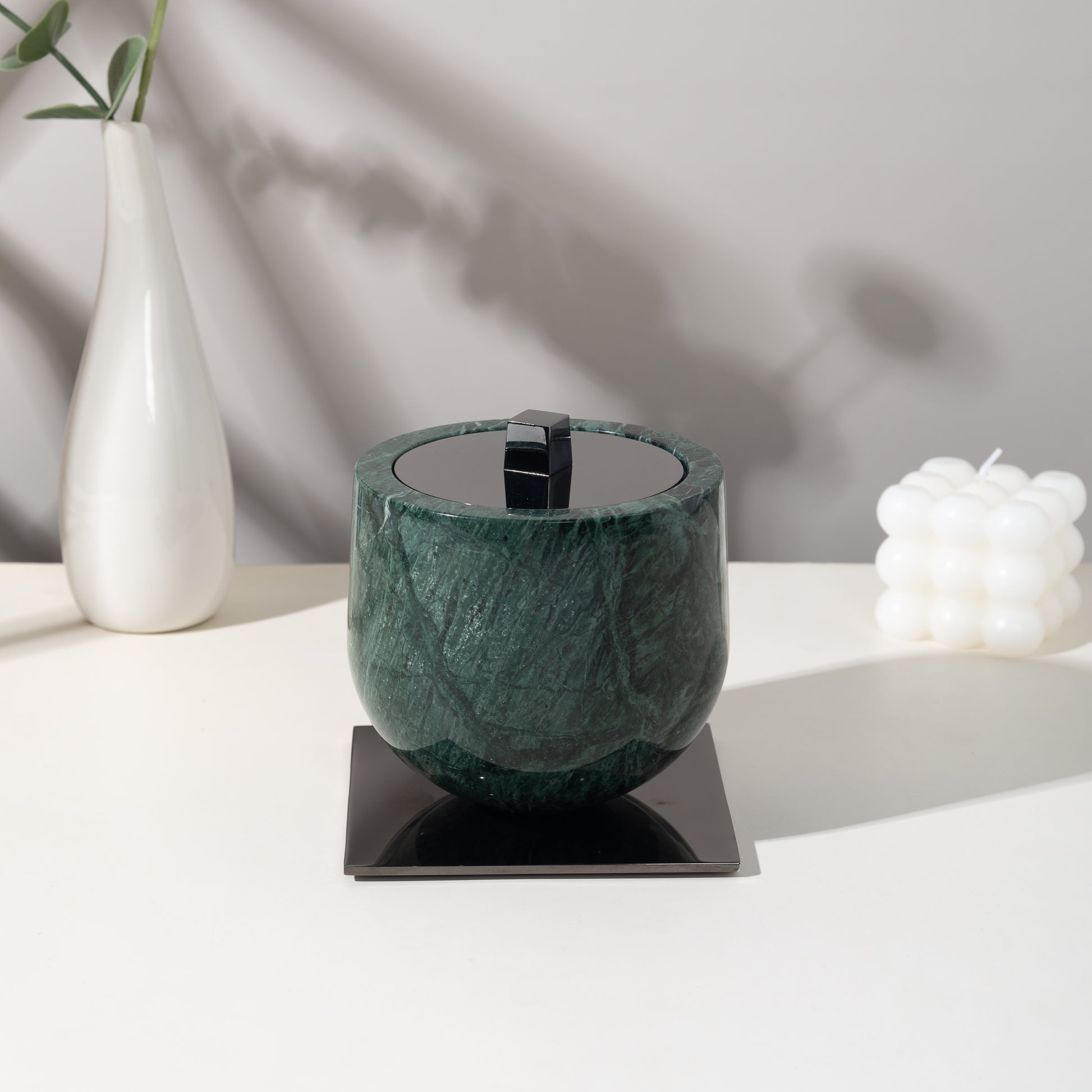 The Piani Verde canister balances clean geometry with natural artistry. Crafted from deep emerald-toned marble and topped with a polished stainless steel lid, it provides elegant storage for small essentials. Honed and hand-polished, each canister brings warmth, weight, and sculptural sophistication to the modern bath.
