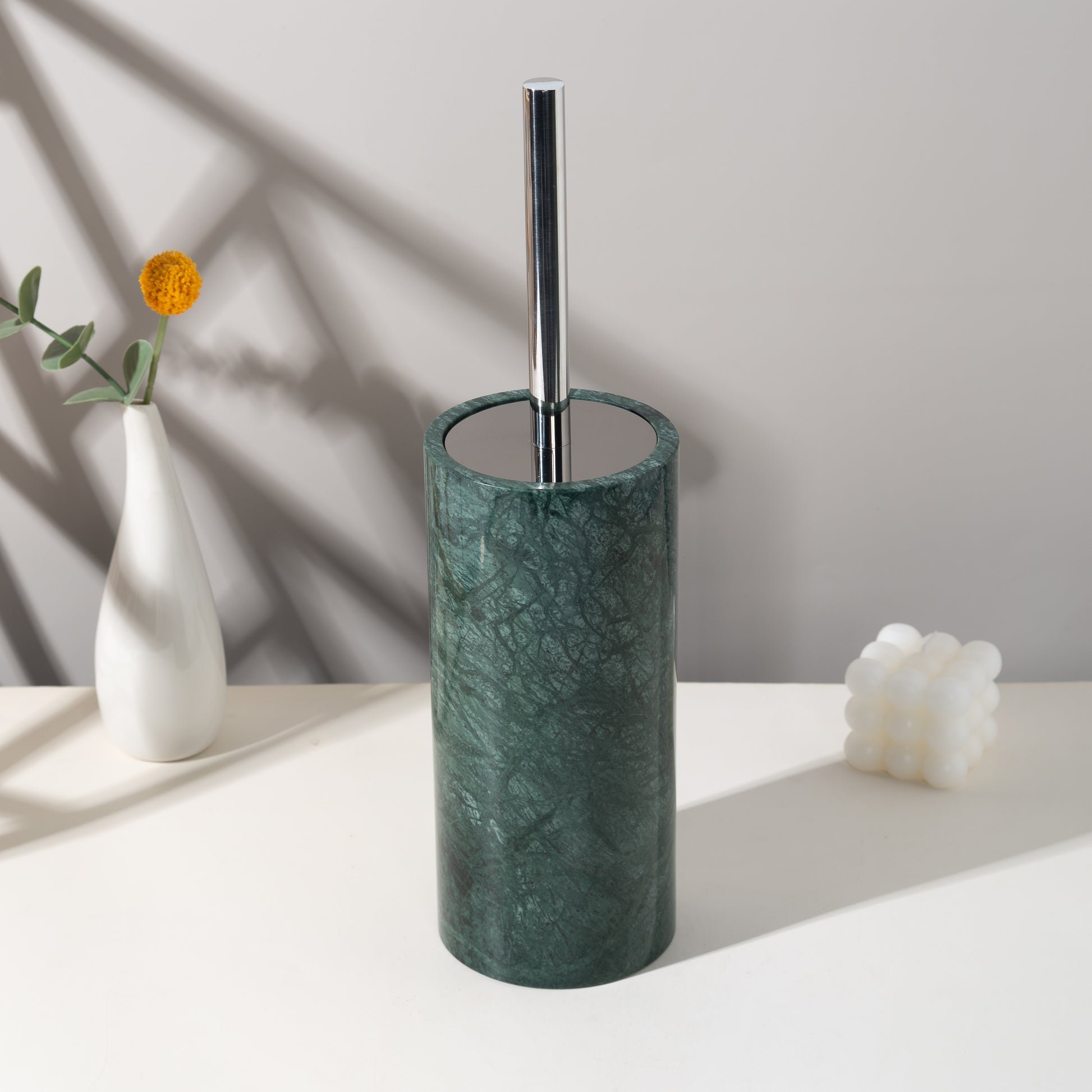 Sleek and enduring, the Piani Verde toilet brush blends practical function with sculptural detail. Featuring a substantial green marble base and polished stainless steel handle, it adds quiet strength and sophistication to any bathroom—proving even the most utilitarian objects can reflect thoughtful design.